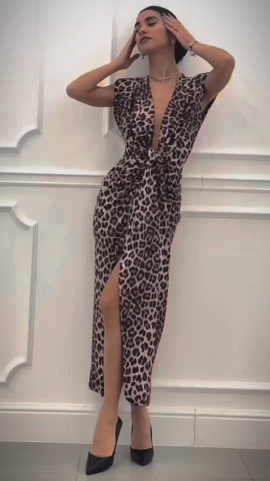 Robe décolletée imprimé léopard à épaulettes - léopard